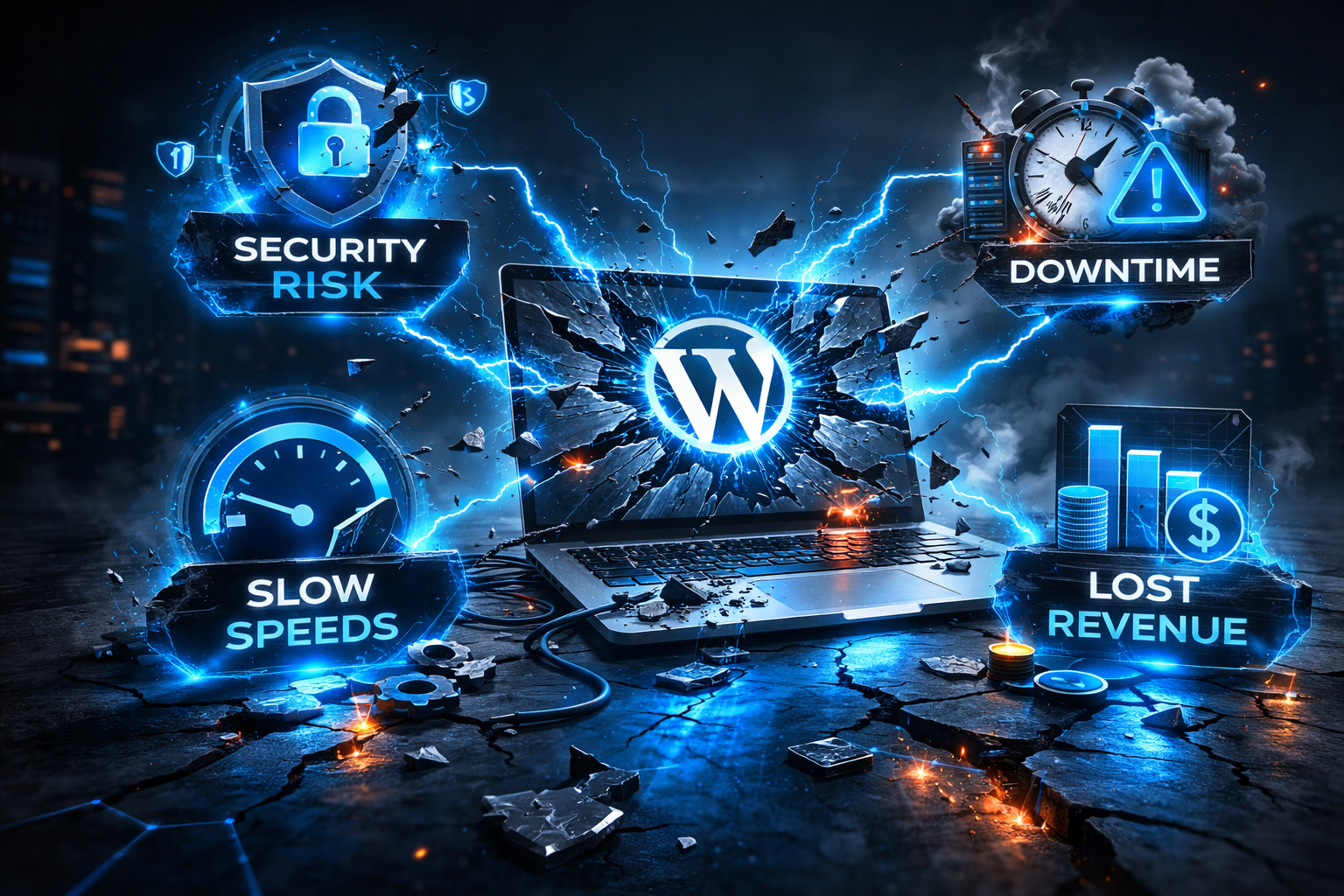 Outdated plugins account for 98% of WordPress hacks. Slow sites lose 7% of conversions per second of delay. Security breaches cost $194,000 average.